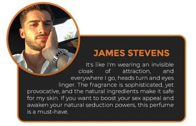 "Már egy ideje hordom ezt az illatot, és be kell vallanom, hogy egyszerűen nem tudok neki ellenállni. A természetes illatok és feromonok csábító keveréke olyan csábító aurát hoz létre, amely vággyal tölti el a nőket. Olyan, mintha egy láthatatlan vonzás köpenyt viselnék, amitől az emberek elfordítják a fejüket, és abbahagyják, hogy rám nézzenek, bármerre is járok. Az illat az én bőröm biztonsága és stimulálása. Ha szexuális vonzerőt szeretne adni, és felébreszti a természetes varázsát, ez az A parfüm kötelező” – James Stevens, Lewisville, Texas