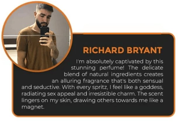 "Lenyűgözött ez a csodálatos illat! A természetes összetevők finom keveréke csábító illatot hoz létre, amely egyszerre érzéki és csábító. Minden fröccsenéskor istennőnek érzem magam. Van benne valami érzéki és szexi. Valami ellenállhatatlan. Az illat hosszabb ideig megmarad a bőrömön, és mágnesként vonzza a többieket. Az illat és az illat komplexitása egyszerre lenyűgöző. nem lehet nem érezni... elektromos bájt, ha alapvető vagy, ha ki akarod szabadítani a belső nimfomániádat. – Richard Bryant, Lafayette, LA