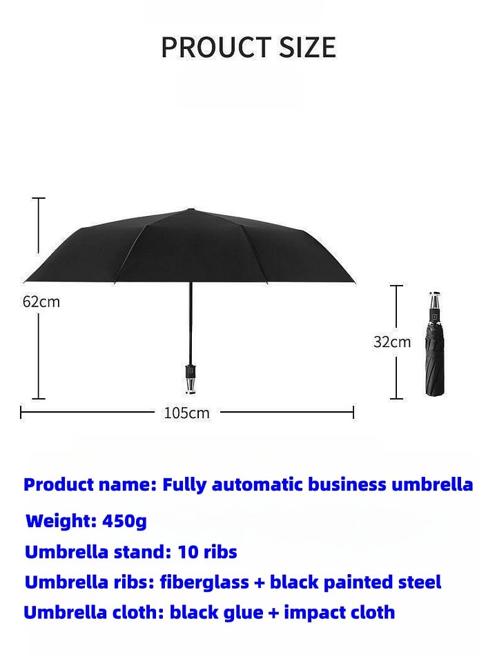 [Kiváló minőségű anyagok] Ez a termék kiváló minőségű rozsdamentes acélt és vastagított festett esernyőrudakat használ az esernyőtest szilárdságának és stabilitásának javítása érdekében. A nagy sűrűségű esernyőkendő víz- és napálló, hogy ellenálljon a rossz időjárásnak. A gomb automatikusan nyílik és záródik, így könnyen használható.